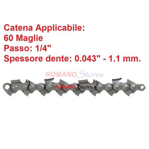 | CARATTERISTICHE TECNICE: : | Lunghezza: 10" - 25 cm. Passo 1/4" Scanalatura: 0.043" - 1.1 mm. Lunghezza: 60 Maglie Passo: 1/4" Spessore dente: 0.043" - 1.1 mm. |